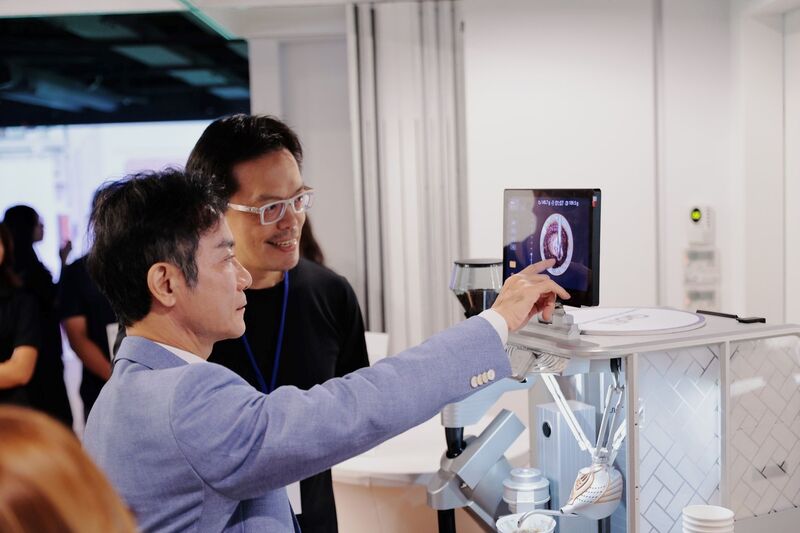 資策會董事長黃仲銘(左)體驗AI手沖咖啡,讓喝咖啡也可以很「科技」。(圖片來源: 財團法人資訊工業策進會)
