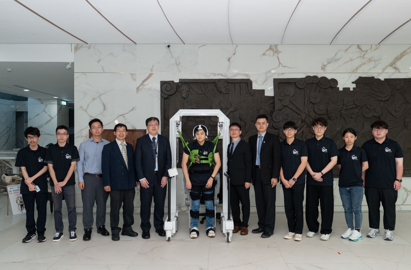 在國科會長期支持下,國立中興大學李聯旺優聘副教授組成跨領域團隊,歷經10年打造全球首創的「AI隨動步行復健機器人(HopeStride)」。左3為高雄醫學大學附設中和紀念醫院復健部陳治廷醫師、左4為高雄醫學大學學士後醫學系陳嘉炘教授、左5為工程處洪樂文處長、左7為國立中興大學機械系李聯旺優聘副教授、左8為國立陽明交通大學電控工程研究所柯立偉教授