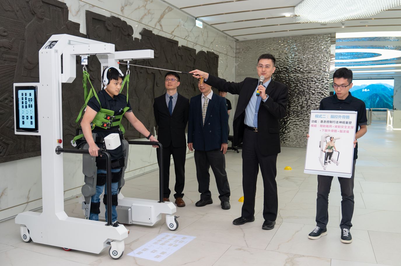 此系統整合隨動載具、動態減重、外骨骼與非侵入式無線腦機介面,可讀取患者腦部訊號並解析運動意圖,進而驅動外骨骼完成安全、自然的步態訓練;從站立、平衡、步態引導、自然行走到腦控訓練皆能一機完成,擺脫以往以被動訓練為主的限制,並能靈活應用於醫院與復健中心。