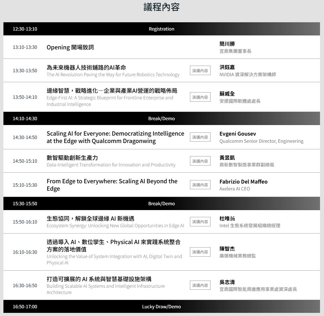 隨著生成式 AI、LLMs、VLMs 等技術日趨成熟,企業不再只是思考是否導入 AI,而是積極尋求在軟硬體整合、效能優化與維運管理等環節的全面升級,尤其邊緣端更是實現 AI 應用落地的關鍵戰場。全球AI解決方案與工業級儲存領導品牌宜鼎國際與子公司安提國際領軍,攜手生態系重量級夥伴,包括Intel、NVIDIA、Qualcomm、Axelera、鼎新數智、廣運機械,匯聚各應用場域專家,以全球觀點結合在地化視野,深入探討產業 AI 化的關鍵實務,解鎖智慧應用新邊界!邀請您一同共襄盛舉,搶先掌握AI脈動,驅動邊緣AI快速落地。