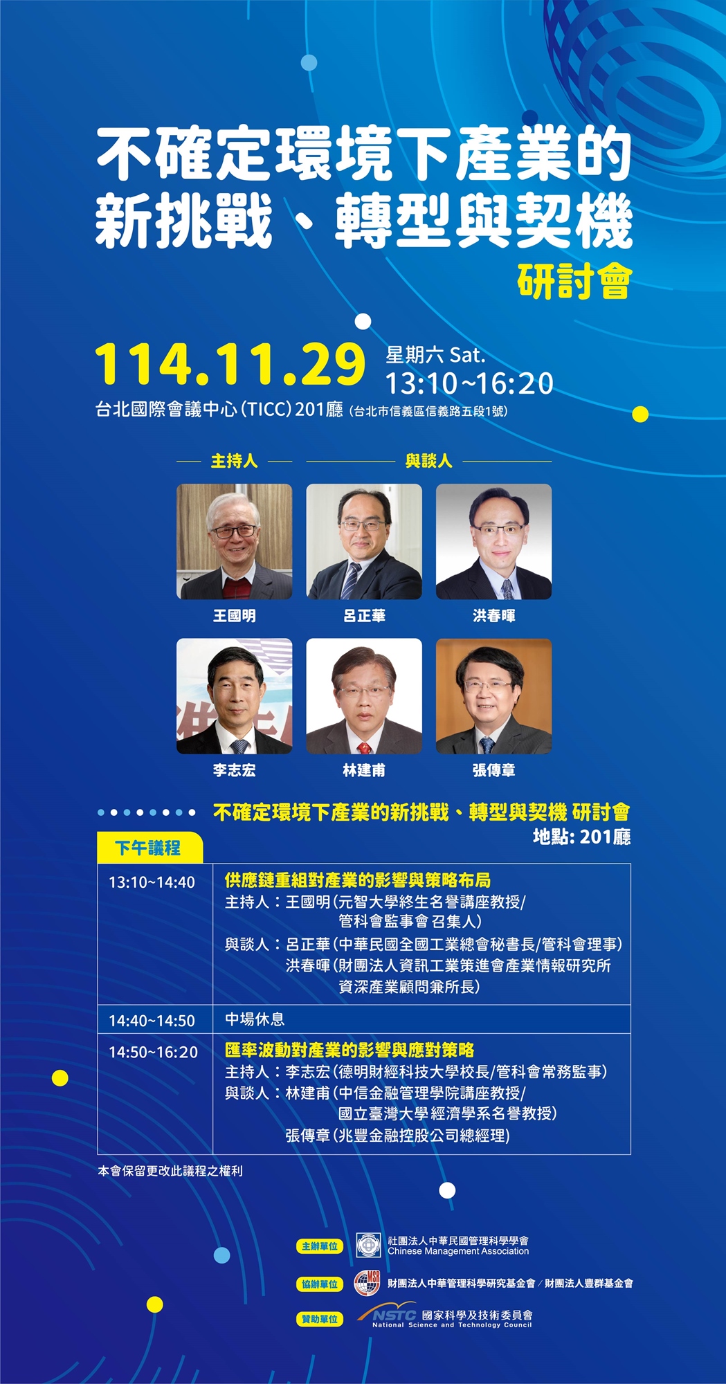 本研討會將邀請產、官、學、研各界專家,共同深入探討企業在不確定環境下,如何因應供應鏈重組與匯率波動的雙重挑戰,並從中發掘轉型升級的新契機,為企業未來發展擘劃永續藍圖。