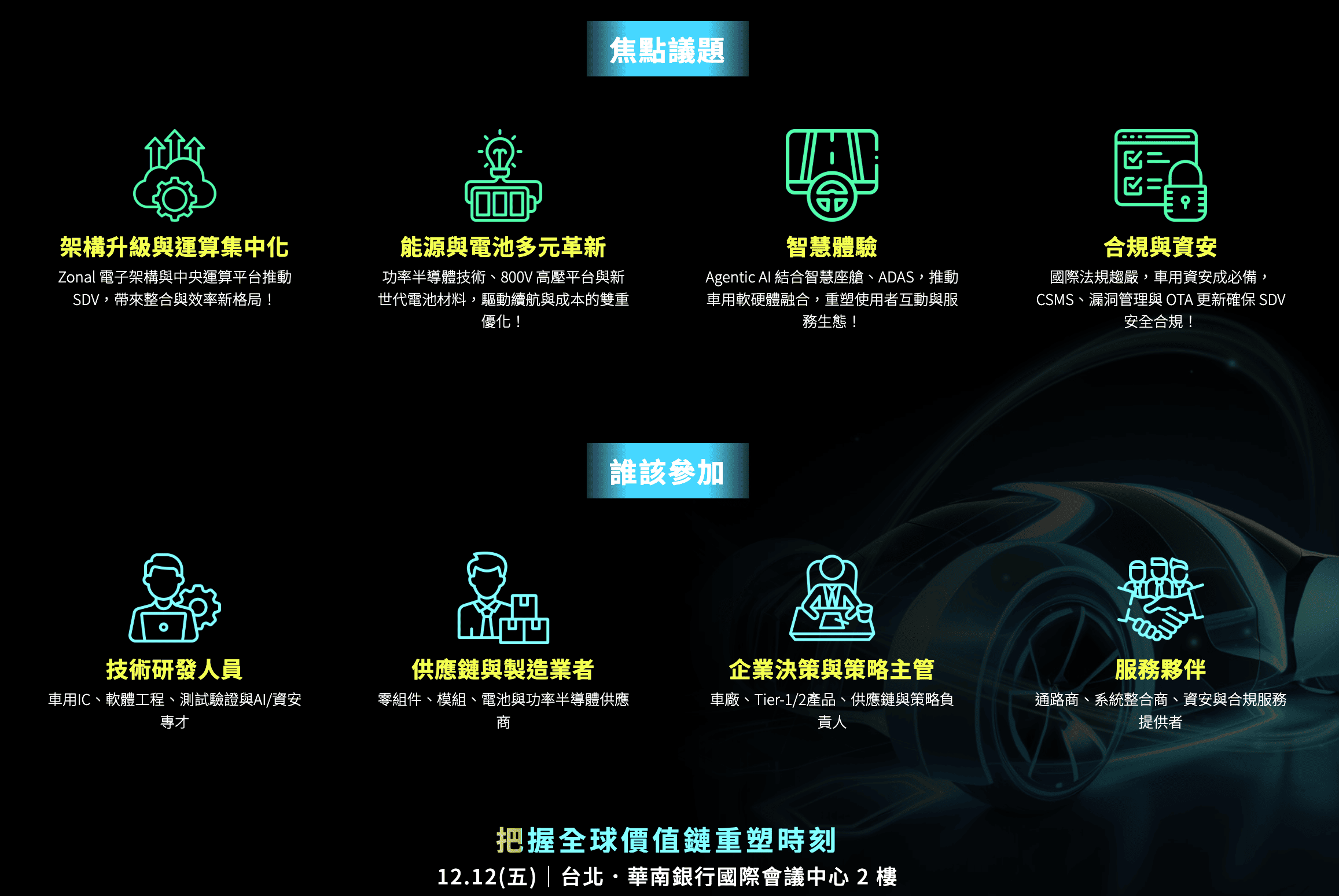 本論壇匯聚各界代表,剖析全球智慧車電趨勢,並探討台廠深耕國際市場的機會與策略。誠邀您共同見證 AI x EV 引領下一代智慧移動,開創產業新未來!