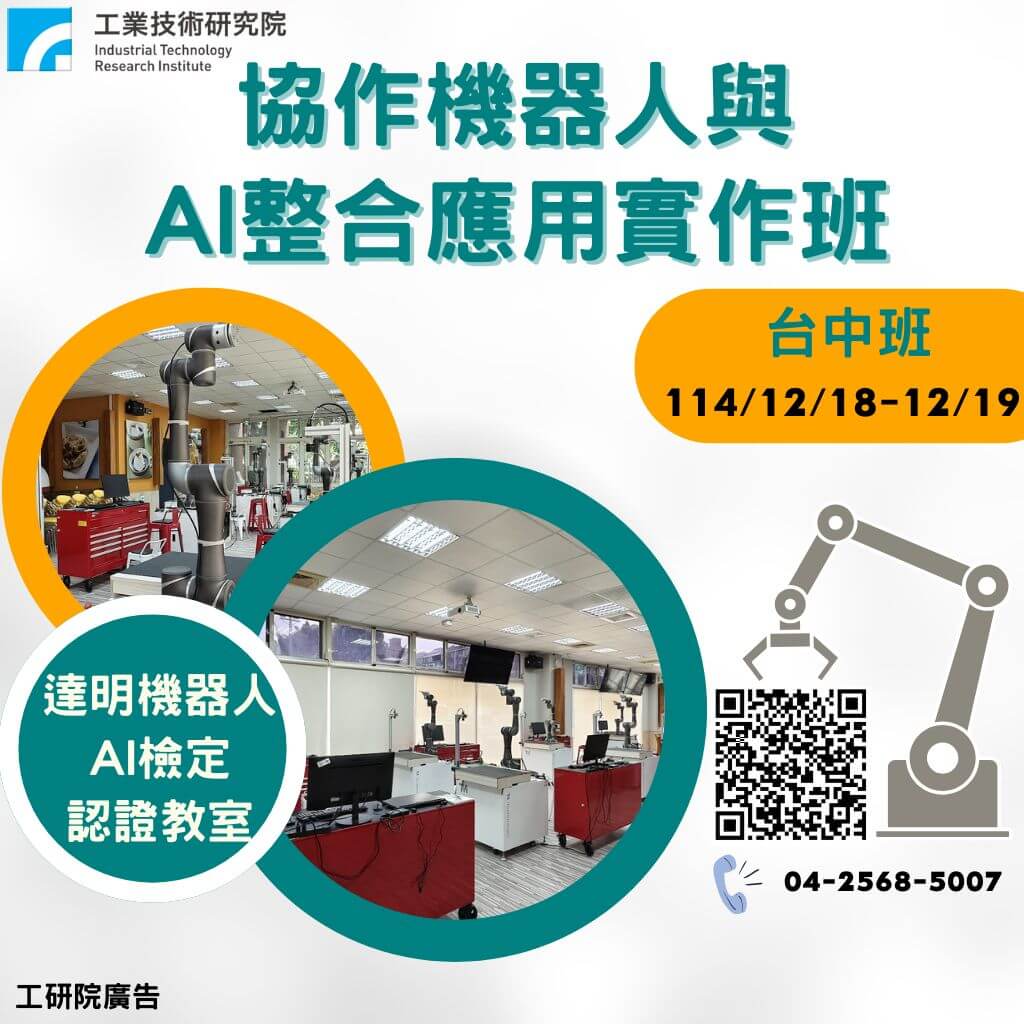 此外,課程強調跨域整合實務,透過AI影像分析與自動化任務設定,讓學員能體驗智慧產線的運作模式。學員完成課程後,將具備協作機器人程式設計與AI應用整合的雙重能力,能獨立規劃與執行智慧製造專案,成為企業數位轉型的重要推手。