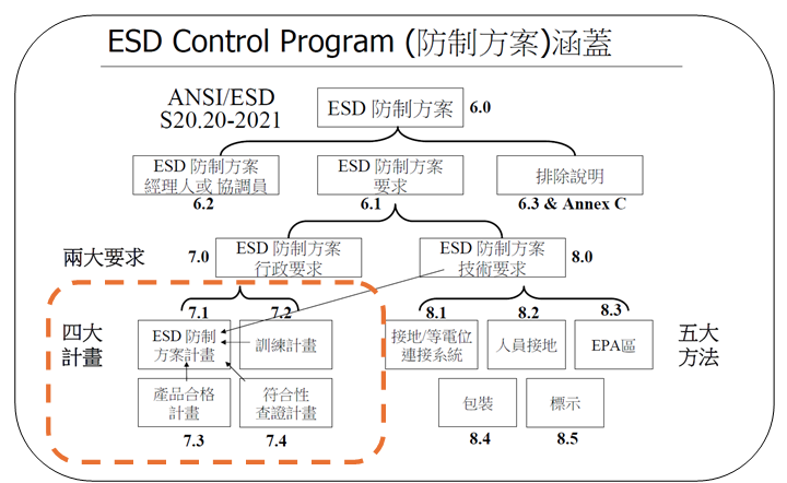 - ANSI/ESD S20.20 的核心目標,在於協助企業針對特定區域建立、實施並維護一套符合標準的ESD防護與技術管理機制。若企業欲取得ANSI/ESD S20.20 認證,除了需遵守技術規範外,還需符合一系列行政管理要求,例如撰寫ESD防制方案計畫、人員教育訓練計畫、產品合格計畫以及符合性驗證計畫等。