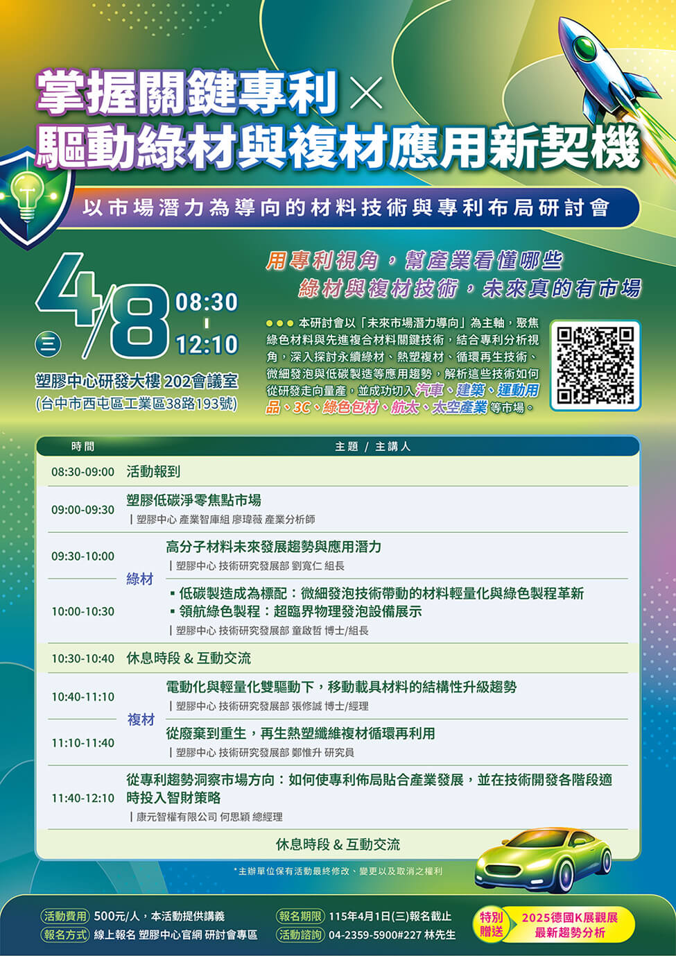 焦點資訊廣告優惠中 首頁 產業快報 掌握關鍵專利 × 驅動綠材與複材應用新契機 #活動 即將開始 #活動 即將開始 掌握關鍵專利 × 驅動綠材與複材應用新契機 關注 關注 複製連結 說明 時間&地點 了解更多 關注 關注 分享 掌握關鍵專利 × 驅動綠材與複材應用新契機 2026-04-08 立即報名 取消 複製 LINE 時間&地點 時間 08:30 ~ 12:10 日期 2026-04-08 地點 407台中市西屯區工業區38路193號 時間 08:30 ~ 12:10 日期 2026-04-08 地點 407台中市西屯區工業區38路193號 1/1 分享給你 #課程 已經結束 2025-12-16 ~ 2026-02-10 工業技術研究院 【產業新尖兵】智慧農業無人機AI巡檢與物聯網數據分析養成班 (彰化班) 工業技術研究院 #課程 已經結束 台中 2025-06-12 ~ 2025-06-13 工業技術研究院 綠色機械研發工程師培訓班 工業技術研究院 台中 #活動 已經結束 台北 線上 2025-12-03 DIGITIMES Techtonic Shift 展望2026年科技趨勢 DIGITIMES 台北 線上 #活動 已經結束 線上 2025-05-28 緯謙科技股份有限公司 【線上研討會】緯謙科技 x 台灣微軟 智慧製造 x 資安防禦,AI 實現高效轉型 緯謙科技股份有限公司 線上 #課程 已經結束 台中 2025-06-25 ~ 2025-06-26 工業技術研究院 【政府補助】機械零件之熱處理與表面處理技術解析 工業技術研究院 台中 #課程 已經結束 台北 2025-06-28 ~ 2025-07-05 國際商貿文化交流基金會 2025年6月-iPAS 資訊安全工程師(中級)能力培訓班 國際商貿文化交流基金會 台北 #活動 已經結束 台北 2025-07-04 ~ 2025-07-05 臺灣創意經濟產業發展協進會 2025 國際健康綠色饗宴 臺灣創意經濟產業發展協進會 台北 #展覽 已經結束 台北 2025-06-05 ~ 2025-06-07 中華民國對外貿易發展協會 2025台灣國際醫療暨健康照護展 中華民國對外貿易發展協會 台北 #課程 已經結束 台中 2025-12-20 ~ 2026-01-04 勞動部勞動力發展署 【產業人才投資方案】組織溫室氣體盤查實務班第01期 勞動部勞動力發展署 台中 AI 塑膠 材料 Python 3D 人工智慧 物聯網 辨識 機械 社群 程式碼 自動化 資料分析 行銷 大數據 智慧製造 程式語言